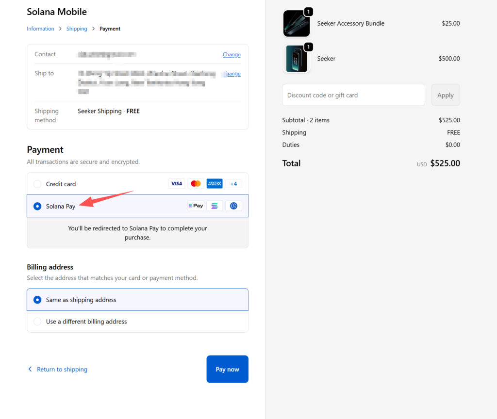 6⃣Shipping可以直接跳过,然后进入“Payment(付款)”页面,这里的关键点是需要选择“Solana Pay”付款