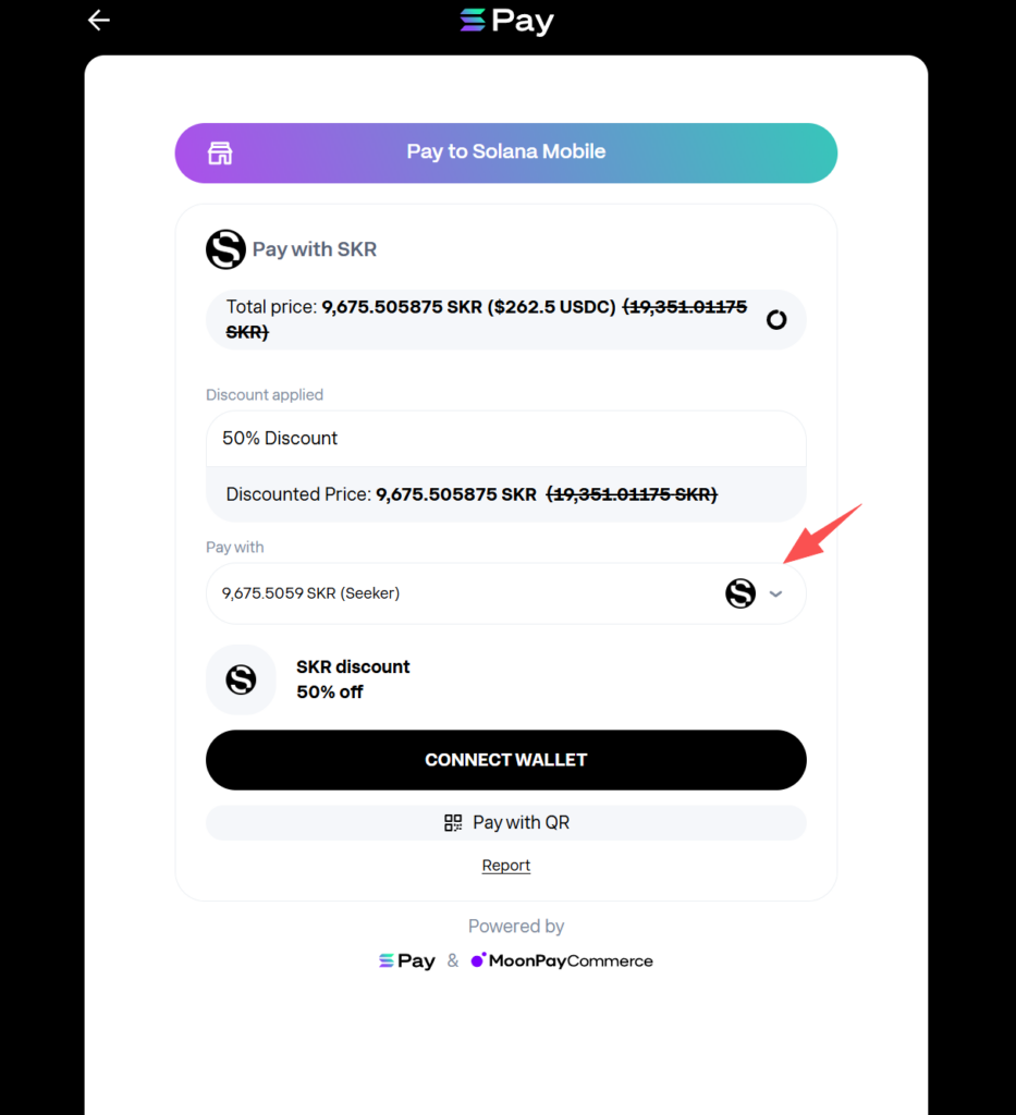 7⃣确认信息后继续点“Pay now”进入付款页面,在这里你可以你可以选择使用 $SKR 支付,选择 $SKR 后会按当前汇率自动折算成50%的购买费用