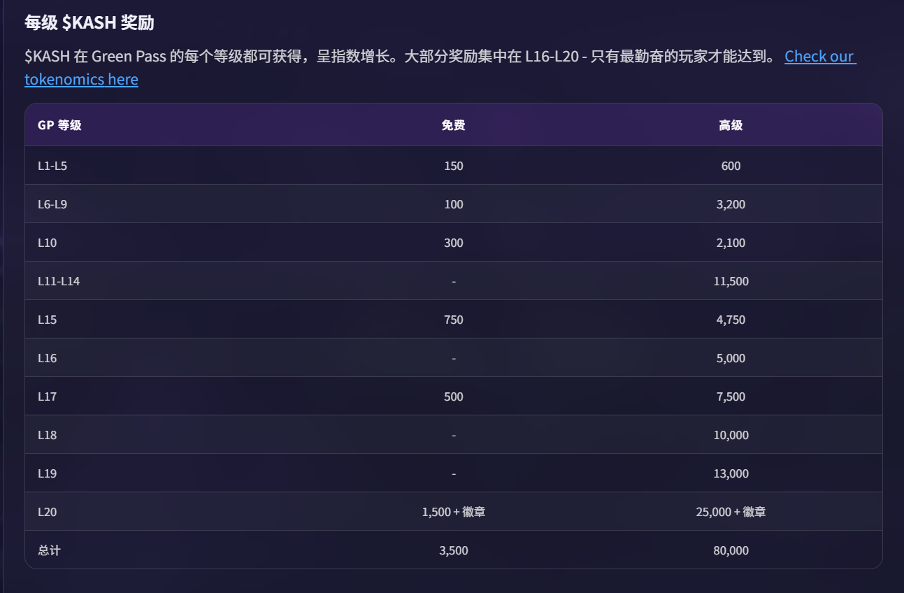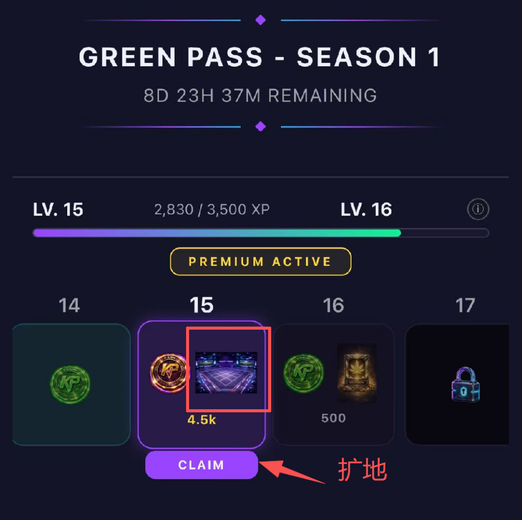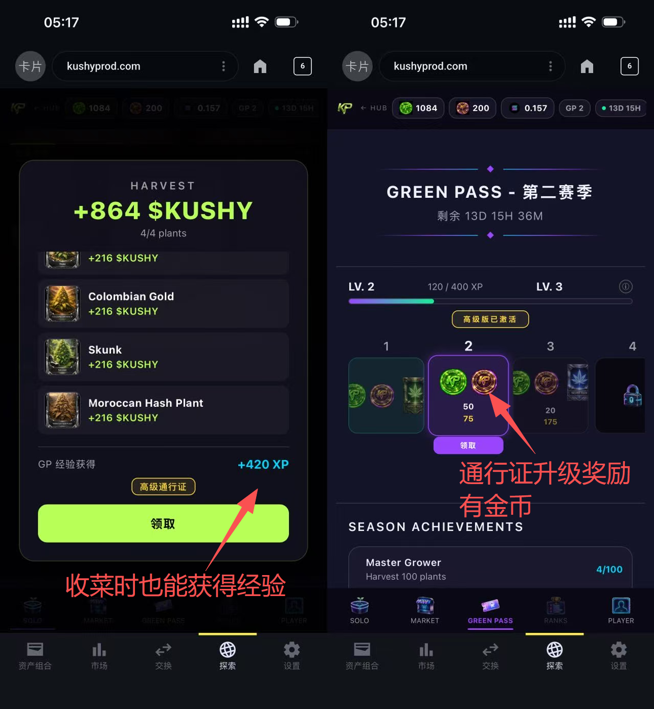 在每次收菜的同时,也能获得经验,经验可以在“GAME PASS”界面升级通行证等级,而每次通行证等级升级的时候,你可以获得奖励,奖励可能包括绿币、$KASH(下称金币)、种子包等