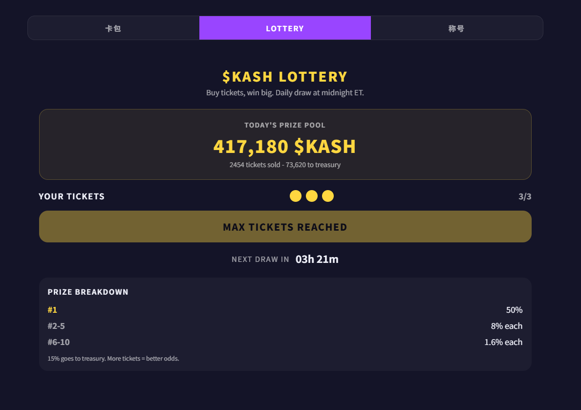 - 市场中顶部选“LOTTERT”是个彩票功能,使用KASH购买,每天可以购买3次,不过每天只能有10人中奖,如果不是运气特别好的,不太建议购买