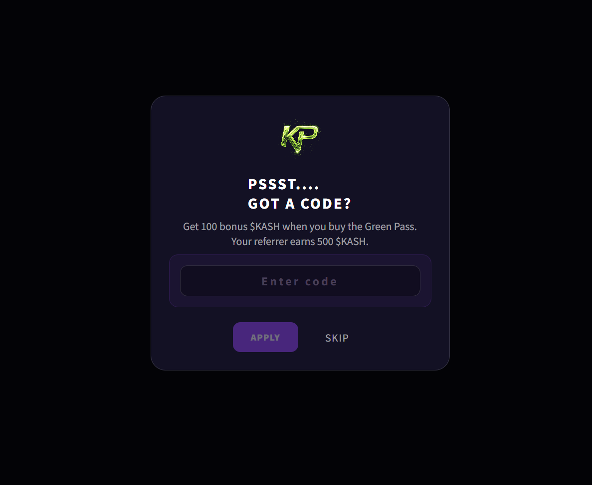 输入Code:0xfei ,这样后续你购买高级通行证时,可以额外获得100 $KASH