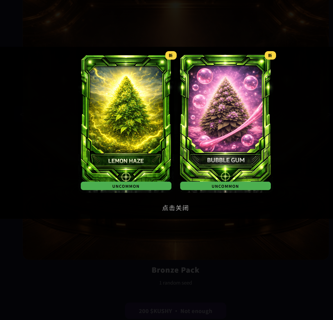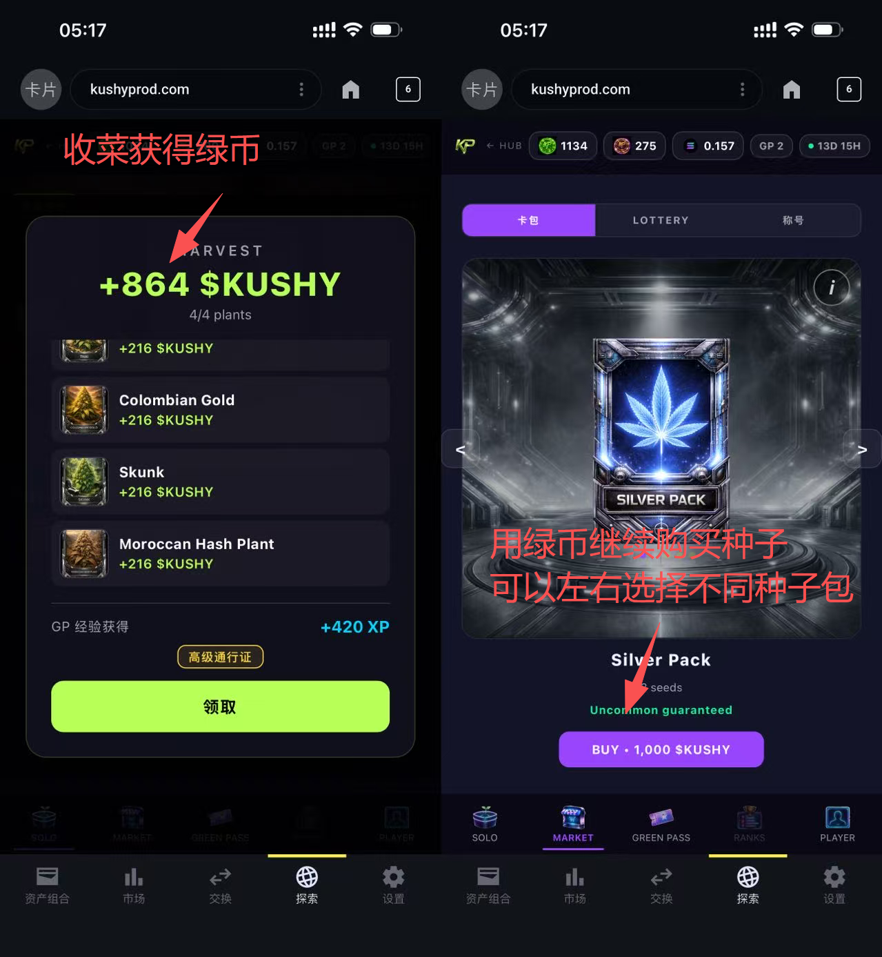 种子种下后,视种子稀有度不同,会有不同的成熟时间,越稀有的种子成熟时间越长,当然收获产出的$Kushy(下称绿币)也越多。