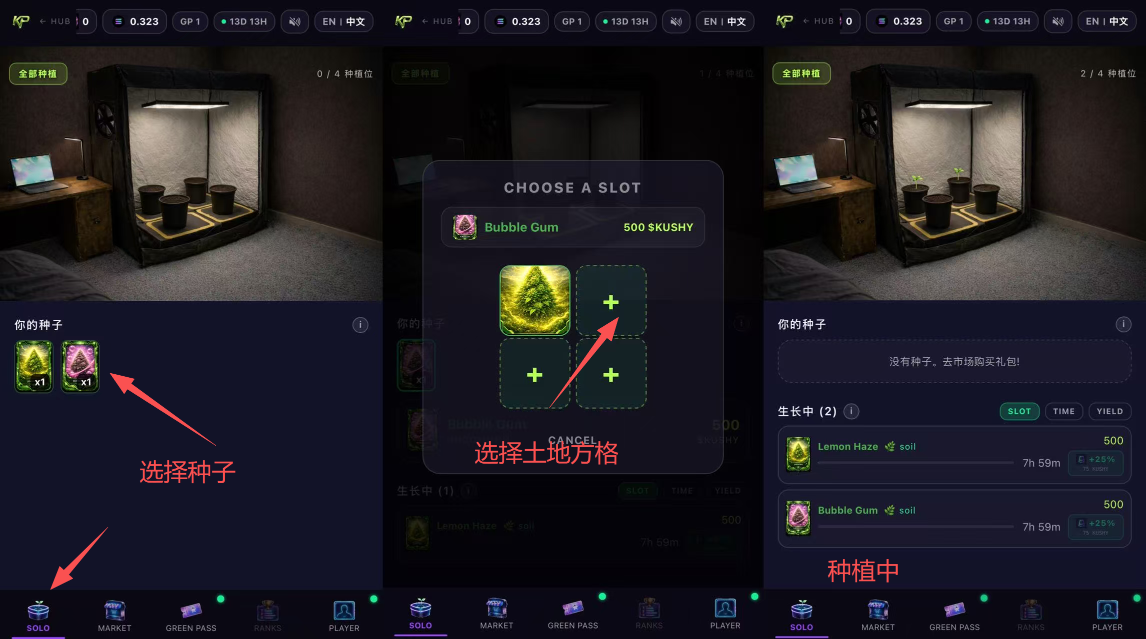 下方点击“SOLO”回到种植主页,选择一个种子,然后选择一个土地方格即可开始种植。这样依次把你所有种子都种下去,初期你的土地可以最多种植4个种子