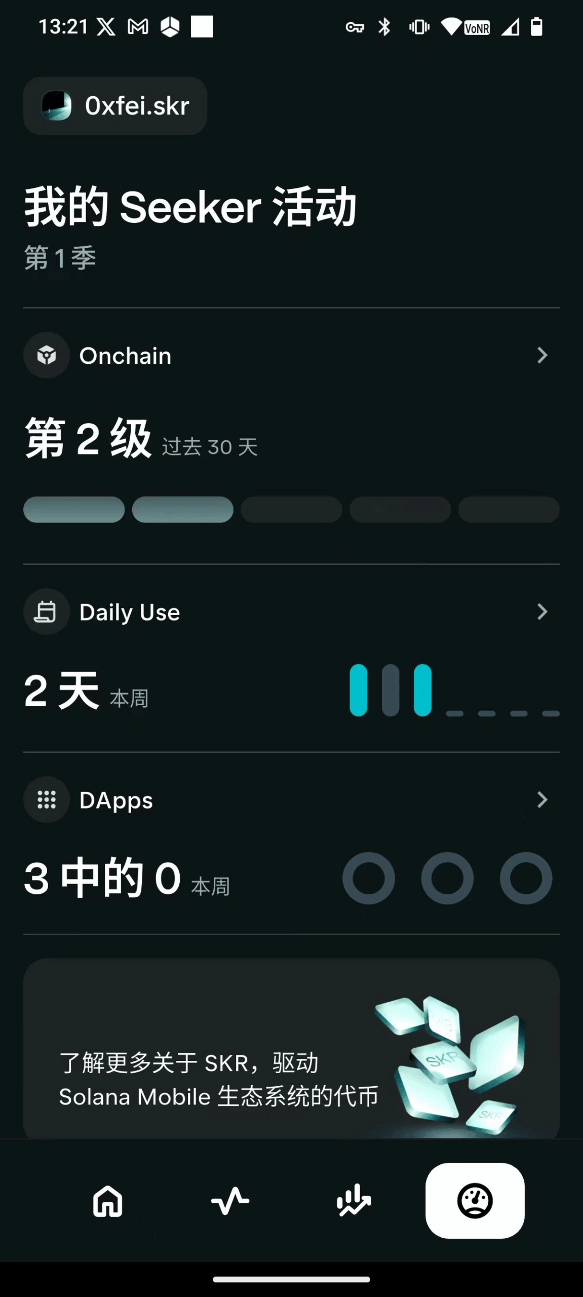 Solana手机/SEEKER与10月15日上线SEEKER活动追踪面板,该面板显示了你的SEEKER手机活跃情况,同时暗示活跃等级会与即将到来的 $SKR 空投挂钩,个人建议作为SEEKER手机最主要的活动之一。
