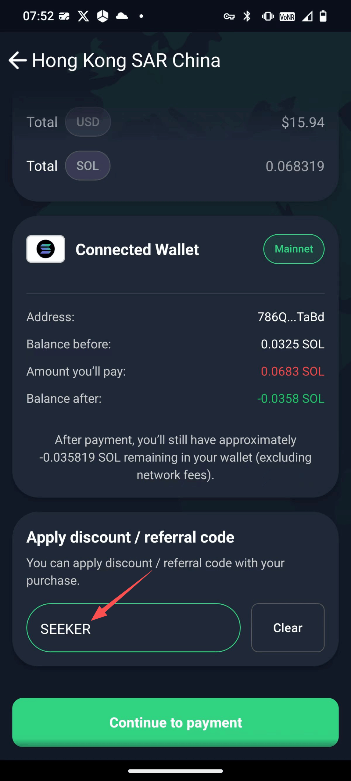选择好你所需地区的eSIM套餐后,在最后结算页面最下方优惠栏填写优惠代码进行购买:SEEKER (注意字母全部大写)