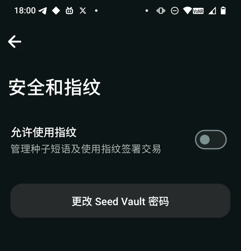 屏幕上拉 → 设置 -进入“Seed Vault” → 安全和指纹 → 关闭允许使用指纹 → 更改Seed Vault密码 →设置一个简单的密码,如6个”8″等等