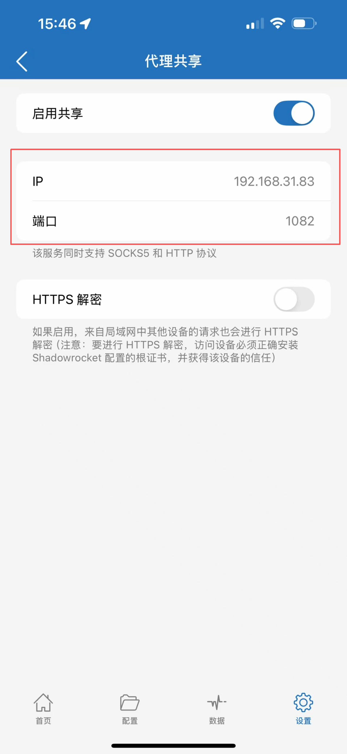 在 iPhone 上打开 Shadowrocket 并开启代理,方式: