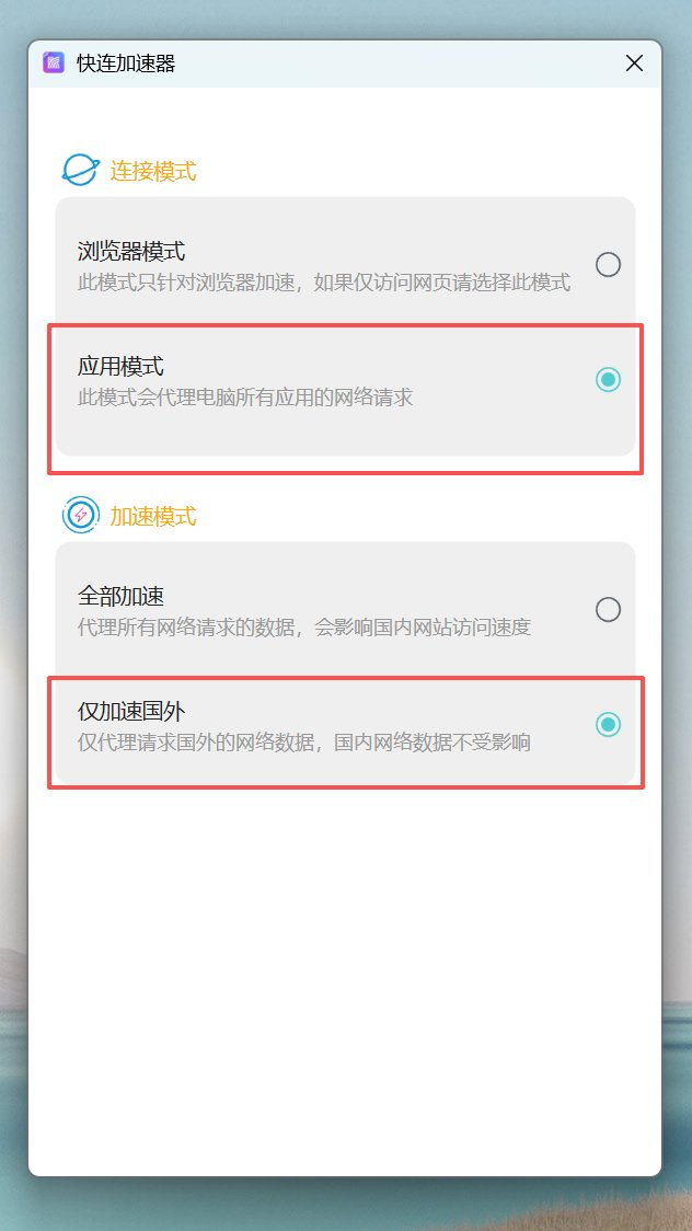 4.打开快连,不用注册(我注册是一直失败的)貌似自带临时账户,切换模式然后直接点击链接,模式设置见下图