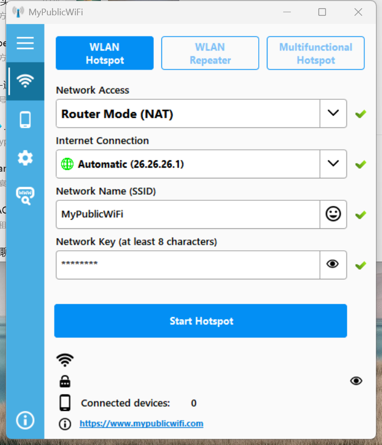 5.打开 MyPublicWiFi,按默认设定即可,点击“start hotspot”