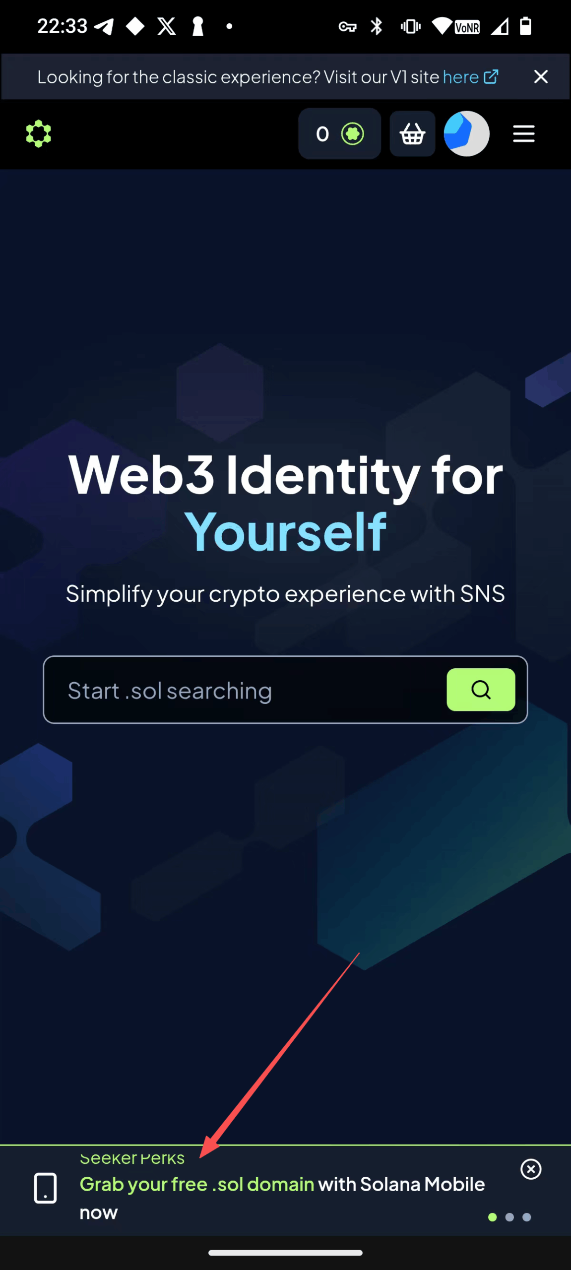使用SEEKER在“dAPP商店”下载“Solana Name Server” → 链接你含有有“Seeker Genesis Token”的钱包 → 在sns页面底部banner选择“Grab your free.sol domain”进入领取页面 → 输入你想要的域名 → 签名领取(有少量Gas)