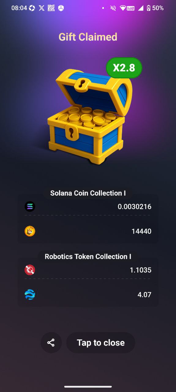 TokenRun是个走路开宝箱的游戏,宝箱里面可以开出各种代币,包括项目自身代币 $GEOD ,也有$SOL $BONK 等。目前的直接福利含只需登录绑定钱包推特等,直接送70个 $GEOD,按当前币价(约0.14U),价值10U,且后续六天签到还能领取80枚$GEOD,如果能邀请4人再领100枚$GEOD(每人25枚),总共下来差不多可以免费领30多U。