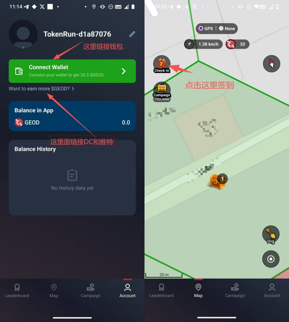 • 然后前往“MAP”界面,点击左上角的“Check in”,完成签到,可以获得20 $GEOD