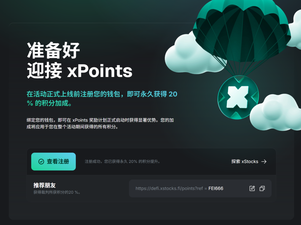 目前xStocks尚未正式开始,已经开通了钱包注册,通过提前注册你打算参与该计划的钱包,该钱包即可获得之后积分计划20%的永久加成,感兴趣的可以先注册起来