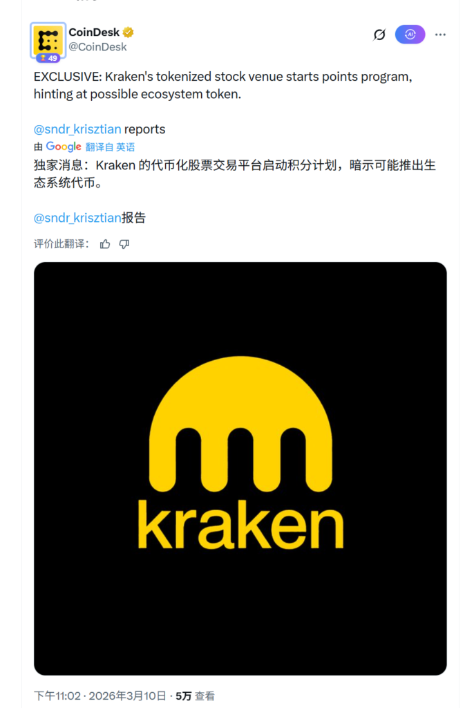 xStocks昨晚在官推中公布积分计划即将到来,该计划的推出可能也暗示着xStocks之后将推出项目本身的生态代币,知名媒体 @CoinDesk 也提到了这种可能性。